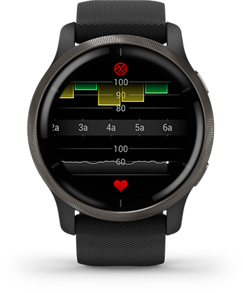 Use the Pulse Ox sensor3 to spot check your blood oxygen saturation at any point during the day, or for part of the night as you sleep, to show how well your body is absorbing oxygen.