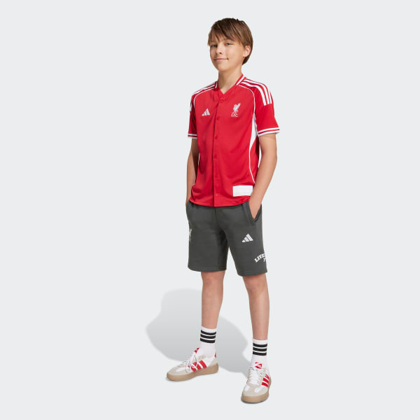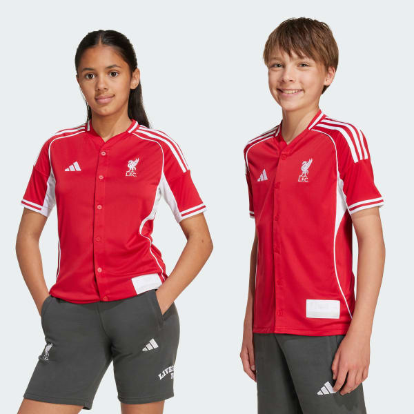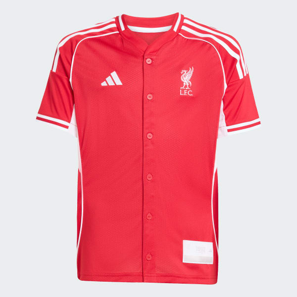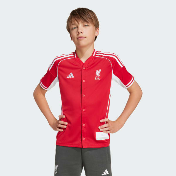 A stylish blend of two of the world's most popular sports. This juniors' adidas Liverpool FC shirt takes a classic baseball jersey and adds a soccer twist. A typical sight on the diamond, those pinstripes and the button closure make a statement, while a club badge adds a more traditional element from the beautiful game.