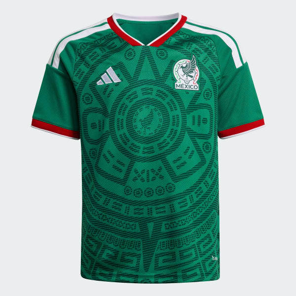 The Mexico 26 Home Jersey is more than just a soccer kit. It's a symbol of pride and passion for young fans that lets them join in the celebration of the World Cup year.The jersey is crafted with adidas' Climacool technology, which wicks and disperses sweat for a cool, dry, and distraction-free experience.The double-knit fabric provides durability and comfort, helping to keep your child relaxed and ready for action, while the iconic color represents the great legacy of Mexico.Whether they're supporting from the stands or playing their first games, let your child feel the excitement of soccer with this jersey. It's another fine blend of heritage and innovation from adidas.Authorised reproduction by Instituto Nacional de Antropología e Historia, "REP.AUT.INAH"