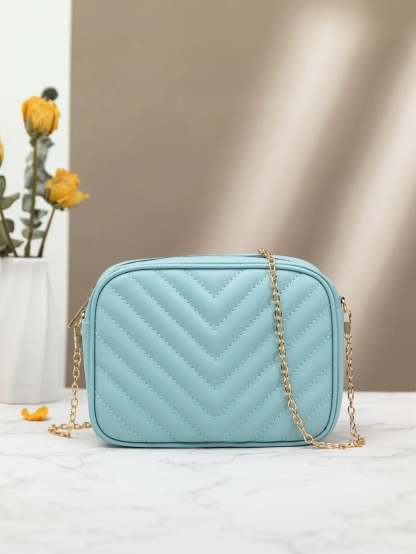 Introducing our Fashionable Chevron Square Bag in a vibrant?Sky Blue hue! This trendy accessory is designed with a stylish Chevron pattern and features a chain strap for an added touch of sophistication. Crafted from high-quality materials, this bag is made of 100% Polyurethane (PU Leather), ensuring durability and a luxurious look.