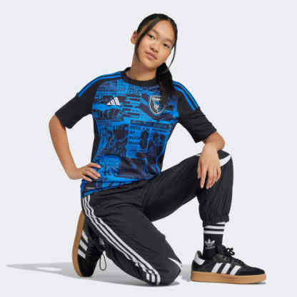 Rock the stands in San Jose Earthquakes style. Displaying a punk band poster-style collage of photos, lyrics and headlines, this juniors' adidas soccer jersey fuses Quakes history with the Bay Area's rebellious music scene. Backstage, moisture-managing AEROREADY keeps you comfortable while you sing for your team. Taking the spotlight, a sewn-on badge and eye-catching "San Jose" sign-off have the final word.This product is made with 100% recycled materials. By reusing materials that have already been created, we help to reduce waste and our reliance on finite resources and reduce the footprint of the products we make.