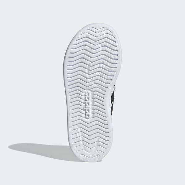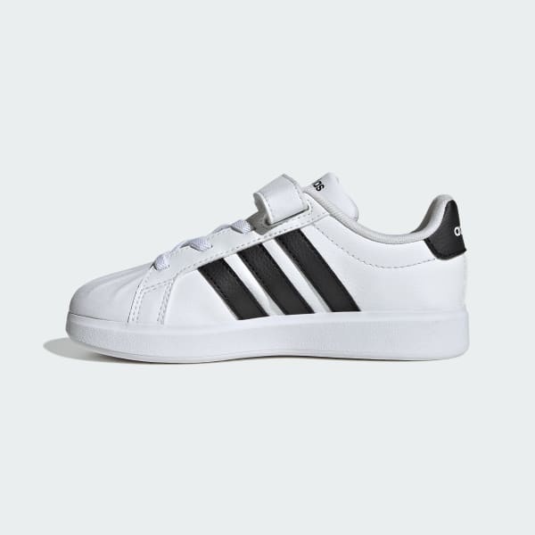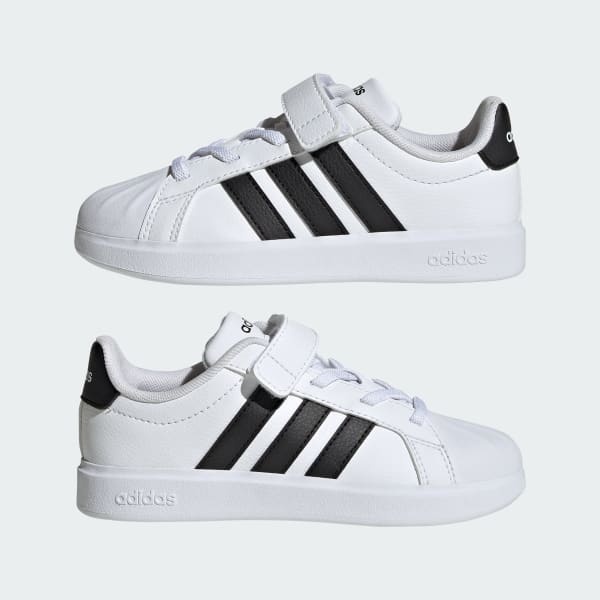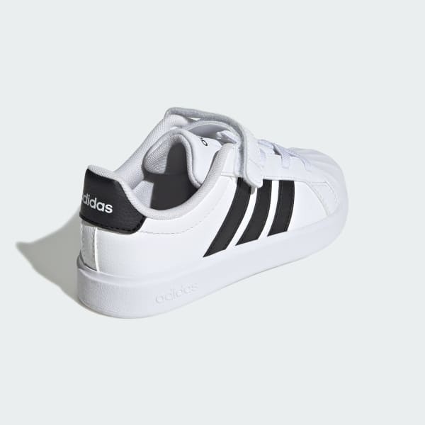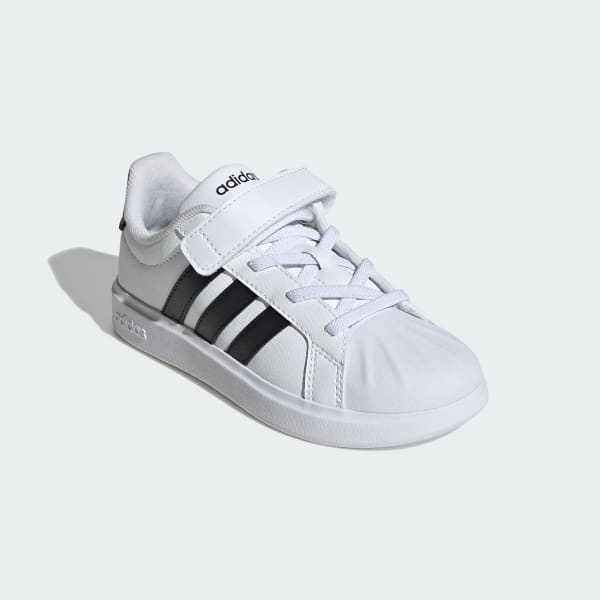 Whether they're running around the park or kicking back at home, these kids' shoes from adidas keep kids comfortable and stylish. The rubber outsole grips the ground as they move, and a synthetic upper with a rubber shell toe cap offers extra durability. Hook-and-loop straps make them easy to slip on and off so your kid is ready for adventure at a moment's notice.