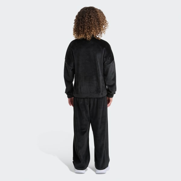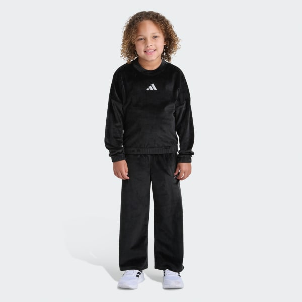 Let kids move, play, and relax in style with the 2-Piece Long Sleeve Crewneck Sweatshirt and Wide Leg Pants Velour Set from adidas. This set brings together a plush velour sweatshirt and matching wide-leg pants, making it a go-to for everything from school days to weekend adventures.The regular fit offers comfort and a sleek silhouette. Elastic cuffs and waistbands on the sweatshirt help the top stay in place, while the ribbed crew neck keeps its shape through every jump and tumble.The pants feature a comfortable elastic waist for easy on and off, suitable for those busy mornings or quick changes after practice. The velour rib fabric looks luxe, feels soft, and provides durability.Machine washable for stress-free care, this set is built for real life. Add it to your kid’s wardrobe for them to experience the adidas difference.