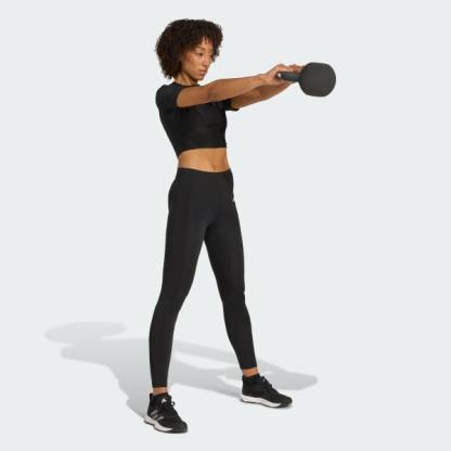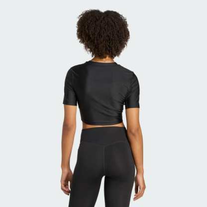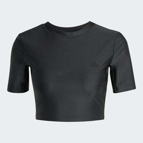 Add some shine to your workout wardrobe with this adidas short-sleeve tee. Wear this versatile top for everything from yoga to HIIT to lifting. With its cropped length and lightweight feel, you'll look and feel your best while training. AEROREADY absorbs moisture to keep you dry.