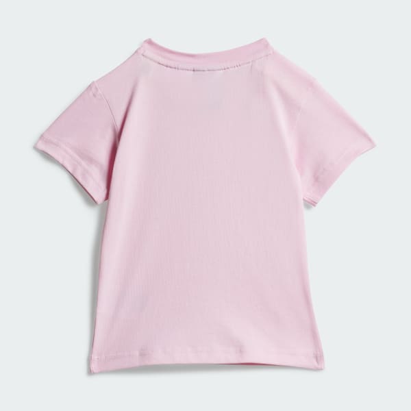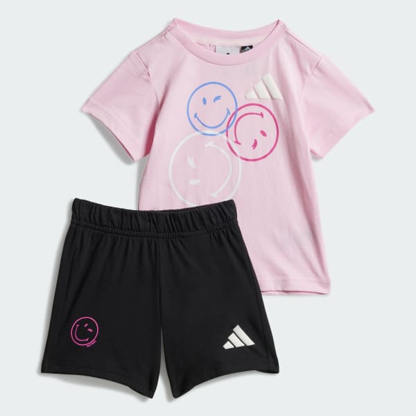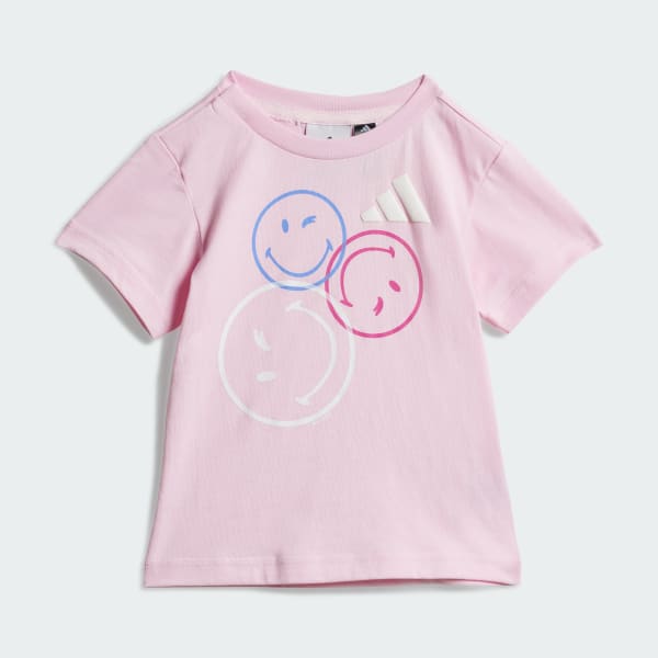 This adidas infant tee and shorts set is all about spreading cheer and keeping little ones comfy. A collaboration with SmileyWorld, both pieces feature the brand's iconic smiling, winking face. The set includes a short-sleeve crewneck tee and a pair of stretchy waist shorts.