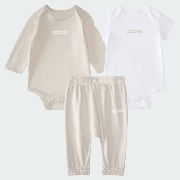 Introduce your little one to comfort and style with the 3-Piece Linear Logo Bodyshirt & Pant Set. This adorable set includes a long sleeve bodyshirt, a short sleeve bodyshirt, and U-shaped jogger-style pants—a practical choice for diverse occasions such as playtime or a family outing.Crafted from soft cotton, the items feel soft against your little one’s skin. Both bodyshirts feature lapped shoulders and crotch snaps, making changing a breeze. The jogger-style pants come with an elastic waist and cuffs, providing a snug fit that moves with your child. With its machine-washable design, this set is as practical as it is stylish. Let your child discover the world with this must-have set from adidas. Make it an everyday addition to their wardrobe for active days and cozy nights.