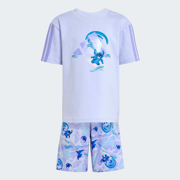 Young fans of Disney's Lilo & Stitch are all set for adventure in this kids' tee and shorts set from adidas. Stretchy cotton fabric keeps them comfortable whether they're exploring the backyard or curling up for story time. A puff-print graphic on the tee and an allover print on the shorts keeps the fun going.
