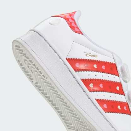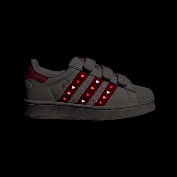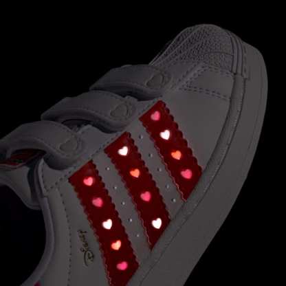 Two legendary classics meet in this enchanting collaboration—one of Disney's most beloved characters and the iconic adidas Superstar. Complete with LED lights, these shoes are designed to enthrall.With LEDs embedded in the 3-Stripes and shoe tongue, every step your little one takes becomes a light-filled adventure. Playful Disney details pair with trademark Superstar features to create a fun yet classic look.The comfort closure with hook-and-loop straps makes it easier to get ready for playtime, while the durable rubber outsole is built to withstand hard knocks. Bring some sparkle to your little one's world with this captivating classic.