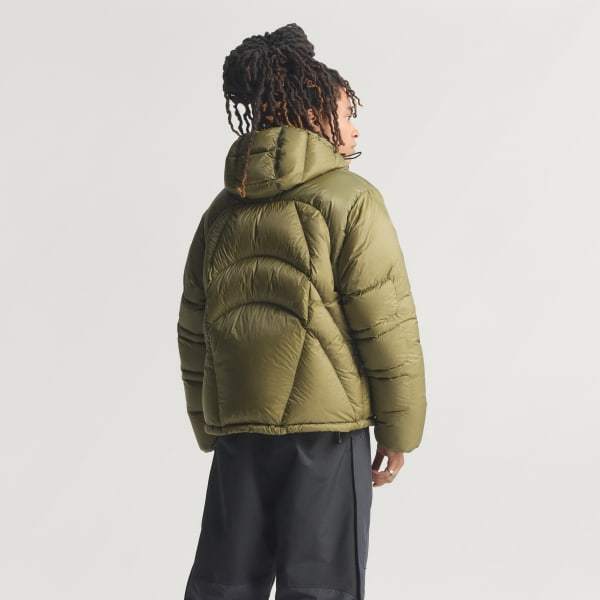 Down jacket with drawstring-adjustable hem and hood for a personalized fit.