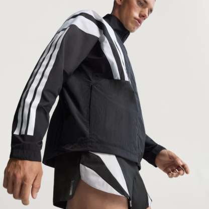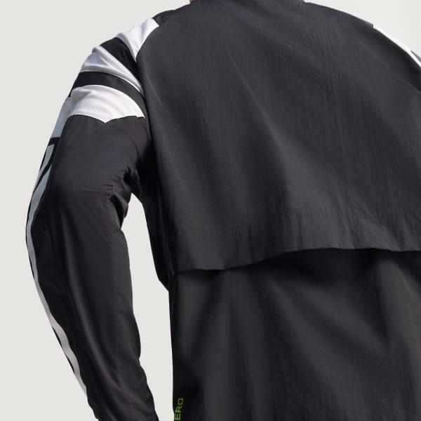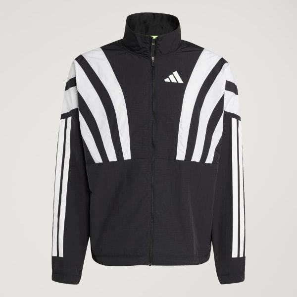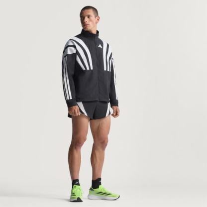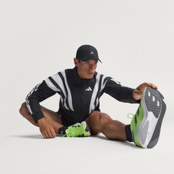 Channel the spirit of the past while running in the present in this adidas Adizero running jacket. Lightweight ripstop fabric with underarm vent panels offers versatile performance for warm-ups and cool-downs. Reflective details add low-light visibility and a durable water-repellent treatment resists damp conditions.