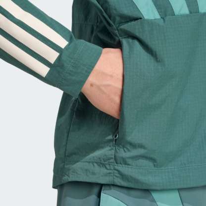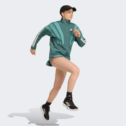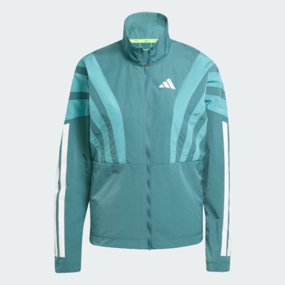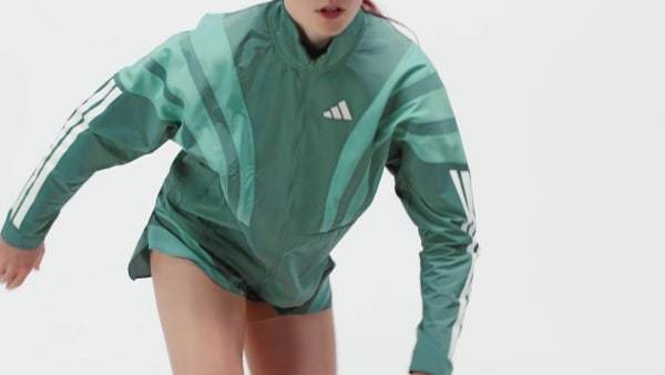 Channel the spirit of the past while running in the present in this adidas Adizero running jacket. Lightweight ripstop fabric with underarm vent panels offers versatile performance for warm-ups and cool-downs. Reflective details add low-light visibility and a durable water-repellent treatment resists damp conditions.