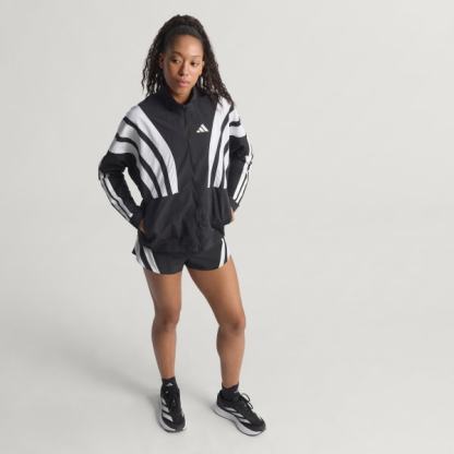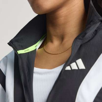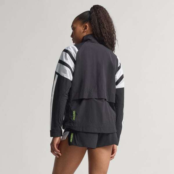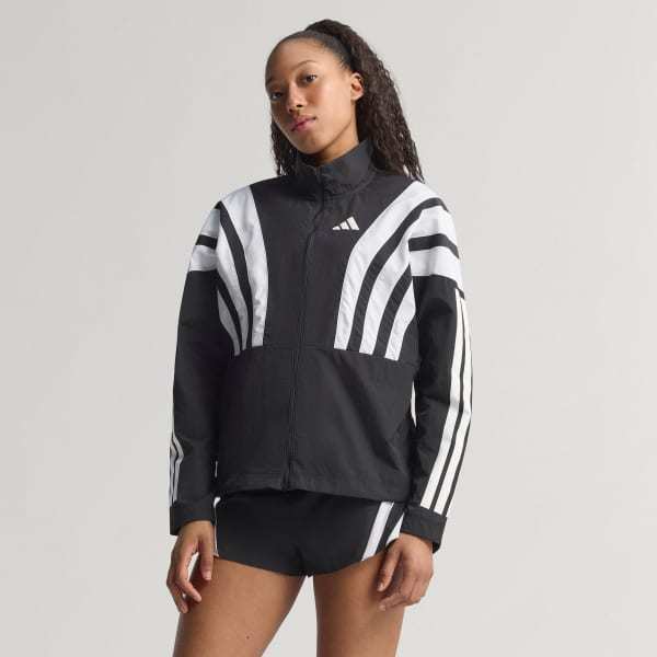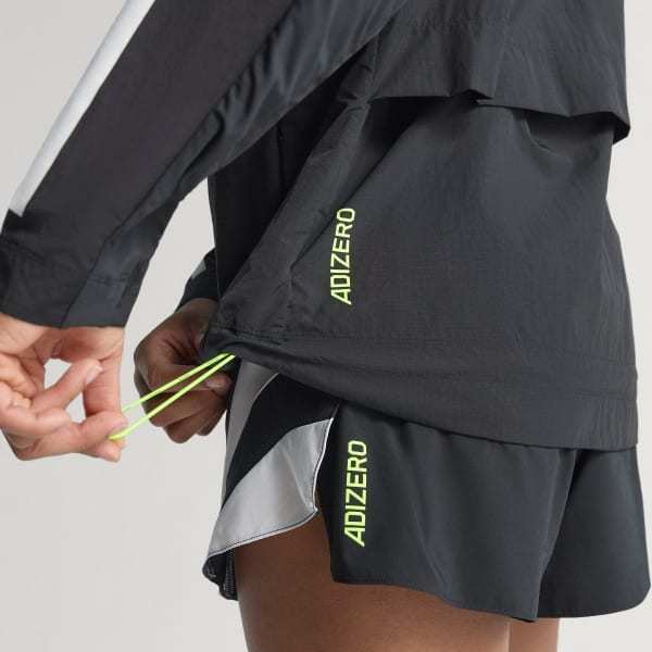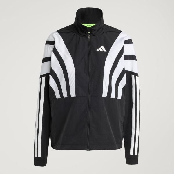 Channel the spirit of the past while running in the present in this adidas Adizero running jacket. Lightweight ripstop fabric with underarm vent panels offers versatile performance for warm-ups and cool-downs. Reflective details add low-light visibility and a durable water-repellent treatment resists damp conditions.