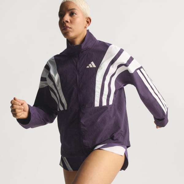 Inspired by heritage running style, this adidas running jacket balances a retro look with modern Adizero performance. A regular fit supports mobility, and ventilated underarm panels help manage body temperature as you warm up. A New York Together graphic celebrates the city that never sleeps, and a DWR finish resists damp weather.