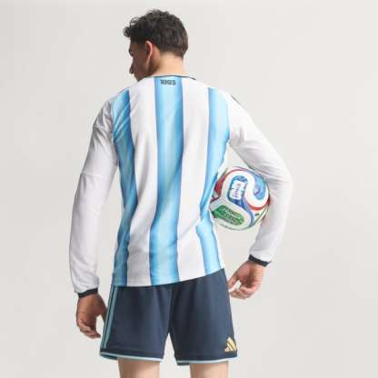When it comes to soccer, heritage and innovation go hand in hand. The Argentina 26 Home Authentic Long Sleeve Jersey celebrates the World Champions and soccer DNA of Argentina. This jersey is a tribute to the team's legacy, inspired by those used in the three World Cup victories ('78, '86, '22). Complemented by matching shorts and socks, it proudly displays the Fed year of foundation as a sign-off.As the official game jersey that the players are wearing on the field, it comes complete with a heat-applied authentic label with hidden UV print to serve as a seal of authenticity. Designed for strong execution, it features Climacool+ technology. Superior engineering and advanced materials unite for a cool, dry, and distraction-free performance, helping you feel fresh and comfortable on the field, even during intense matches. Crafted with transfer-knit jacquard, this jersey offers a tailored, locked-in fit through body mapping. The special collar construction adds a touch of elegance, while the long sleeves provide extra coverage.With bold 3-Stripes and a seasonal collar showcasing its heritage, this authentic piece serves as a symbol of pride in excellence. With adidas, it's more than just clothing. It's a way of life.