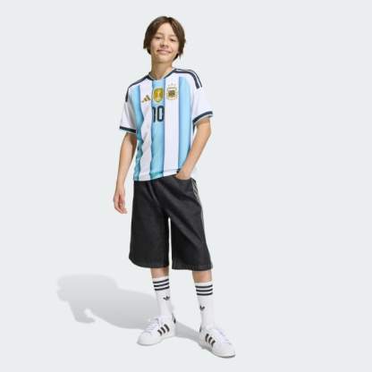 The Argentina 26 Home Messi Jersey is a tribute to the champions of the world. Celebrating Argentina's soccer DNA, this jersey is a nod to the iconic victories of '78, '86, and '22. It captures the essence of the team's journey to glory. This jersey is crafted with Climacool technology. Cool. Dry. Ready. Climacool wicks and disperses sweat for a cool, dry and distraction free performance. The wicking and quick-drying fabric manages sweat, keeping them dry and comfortable during every match. The bold 3-Stripes and seasonal collar add a touch of adidas heritage, making it a must-have for any young soccer enthusiast.