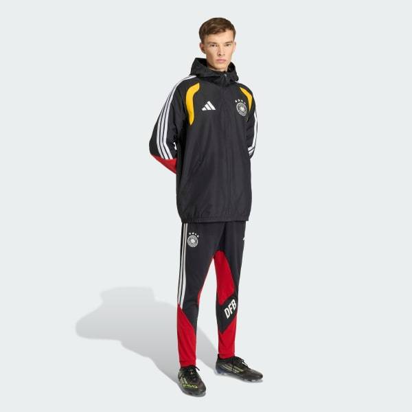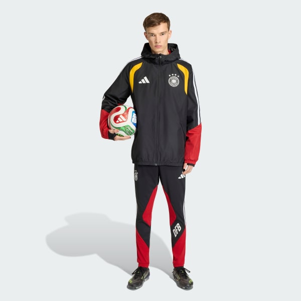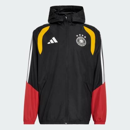 The Germany 26 Tiro All Weather jacket handles poor weather conditions so you can focus on your game. Practical and comfortable, it supports both training and travel with equal ease.A full-zipper front, stand-up collar, and packable hood provide flexible coverage while on the go. Side zipper pockets keep essentials safe, and the normal fit layers effortlessly. Built for performance, the jacket features Clima365 technology, which uses high-tech fabrics to help you feel ready for sport, regardless of the conditions.This utility piece grounds itself in soccer identity—moves with you whatever the forecast—and proudly displays the German team crest and adidas logo as a clear statement of intent.
