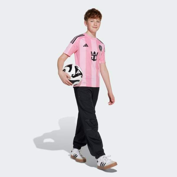 Classic soccer stripes finished in instantly recognizable Inter Miami CF colors. Standing out in two shades of pink, this juniors' adidas jersey leaves no doubts about your favorite club. Created for young supporters, it has moisture-managing AEROREADY for all-day comfort and a premium woven badge for full-on team pride.This product is made with 100% recycled materials. By reusing materials that have already been created, we help to reduce waste and our reliance on finite resources and reduce the footprint of the products we make.