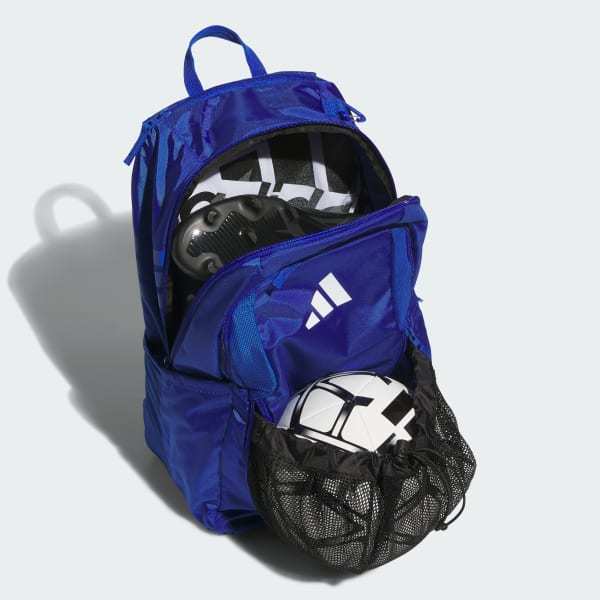 Made from lightweight, durable polyester, this versatile adidas backpack keeps stuff organized and dry thanks to a water-resistant base. Multiple zip pockets keep your gear separated, including one that can hold a size 5 soccer ball and two mesh side pockets that can each hold a 32 oz water bottle. There's also a vented pocket to store dirty gear and a clip to attach essentials. Score!