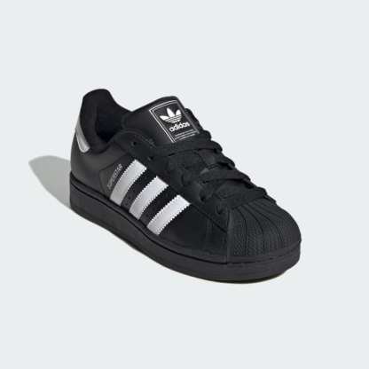The adidas Superstar II shoes are back and ready to dominate the streets once more. With its iconic shell toe design and serrated 3-Stripes, these shoes have spent over 50 years fusing sport and street style. Revamped in clean, versatile black and white, these juniors' sneakers provide all-day comfort with a molded sockliner and structured leather upper. The stable rubber cupsole with classic herringbone traction pattern keeps you grounded and going in class and style. Wear them with practically anything, from glossy basketball shorts to baggy jeans or cargo pants.