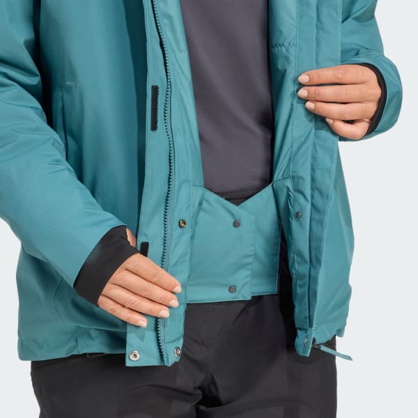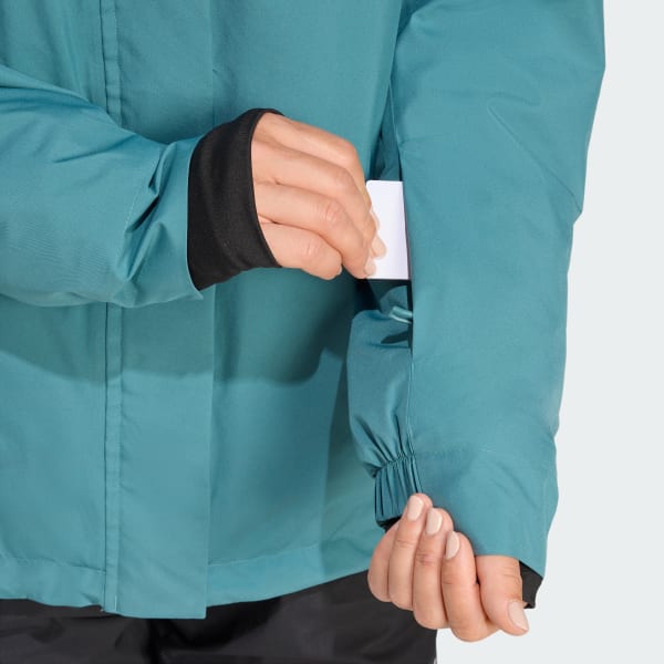 Whether you ski or snowboard, this adidas Terrex insulated ski jacket is your ticket to ride all winter. Two-layer RAIN.RDY delivers waterproof, breathable coverage to keep you dry and comfortable through storm cycles and bluebird days alike. Ski-day details like a high collar and helmet-compatible hood keep you warm, dry and exploring longer.