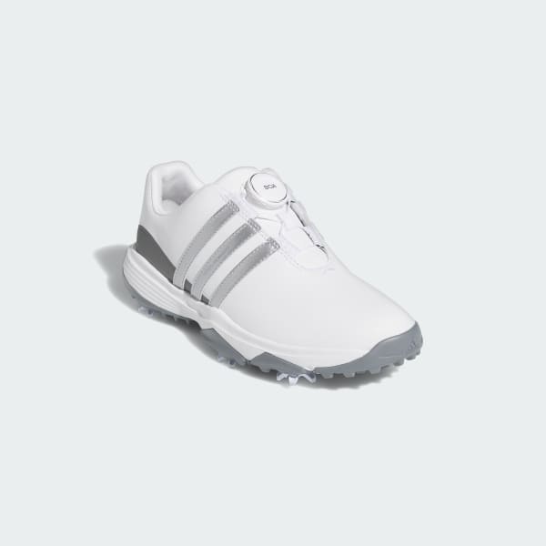 Help your young golfer feel their best. Confidence and style come naturally in these adidas Tour360 golf shoes. Made for tournament play and rising young golfers, they wrap kids' feet in premium materials and feature leading-edge footwear technology for top-level performance. A micro-adjustable BOA® Fit System activates the internal 360Wrap for enhanced hold and support. Bounce midsole cushioning adds full-round comfort for walking, and a waterproof microfiber leather upper seals out wet greens. Elevate their game with golf shoes that inspire playing their best.By choosing recycled, we are able to reuse materials that have already been created, which helps to reduce waste. Renewable materials choices will help us to remove our reliance on finite resources. Our products made with a blend of recycled and renewable materials feature at least 20% total of these materials.