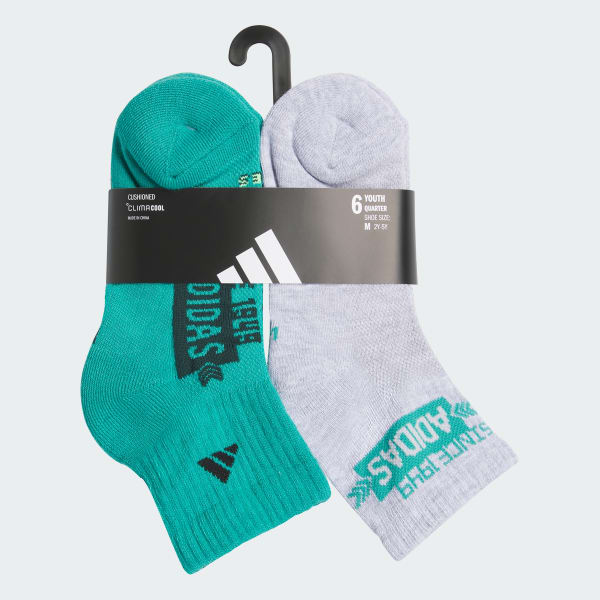 Shoes get all the glory, but it's socks that do the dirty work. The Cushioned Graphic 6-Pack Quarter Socks for juniors are built with adidas CLIMACOOL tech to help feet stay cool and dry from the first rep to the last step. They have knit-in cushioning and stretch for a snug fit throughout.